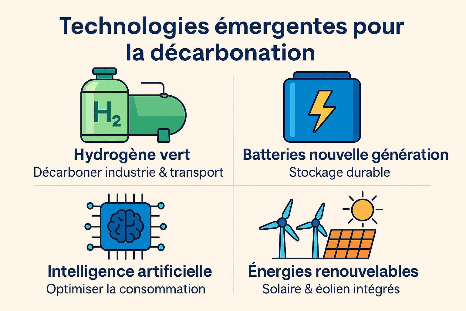 Les technologies émergentes jouent un rôle fondamental dans la transition énergétique et la décarbonation. De l’hydrogène vert aux batteries de nouvelle génération, ces innovations offrent des solutions prometteuses pour réduire notre dépendance aux énergies fossiles. L’hydrogène, par exemple, est envisagé comme un vecteur d’énergie clé pour décarboner des segments difficiles à électrifier, comme l’industrie lourde et le transport maritime.