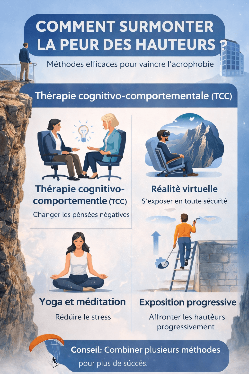 Pour maximiser votre réussite, il est souvent recommandé de combiner plusieurs méthodes. La diversité des approches permet d’adresser les divers aspects de l’acrophobie, vous offrant ainsi une meilleure chance de surmonter cette peur.